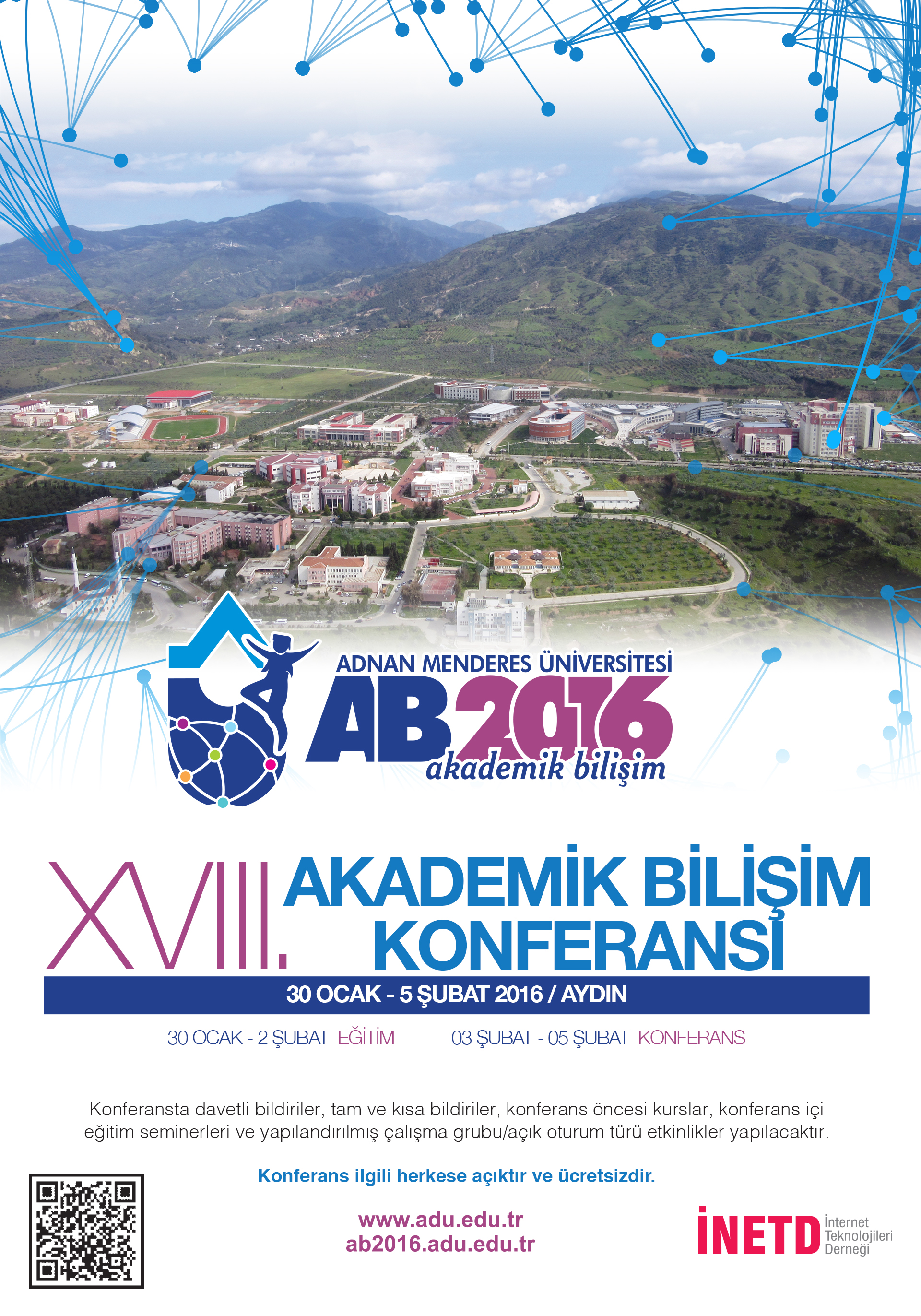 Üniversitelerde bilgi teknolojileri konusunda ilgili grupları biraraya getirerek, bilgi teknolojileri altyapısı, kullanımı, eğitimi ve üretimini tüm boyutlarıyla tanıtmak, tartışmak, tecrübeleri paylaşmak ve ortak politika oluşturmak amaçlarıyla ulusal boyutta düzenlenen akademik bilişim 2016 konferansının 18. si, 30 ocak-5 şubat 2016 tarihleri arasında, üniversitemiz ve ilimiz ev sahipliğinde yapılacaktır.